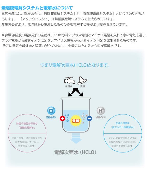 食塩と上水だけで作られていて化学薬品等の添加物、pH調整剤などは一切使用せず中性領域内で生成しています。